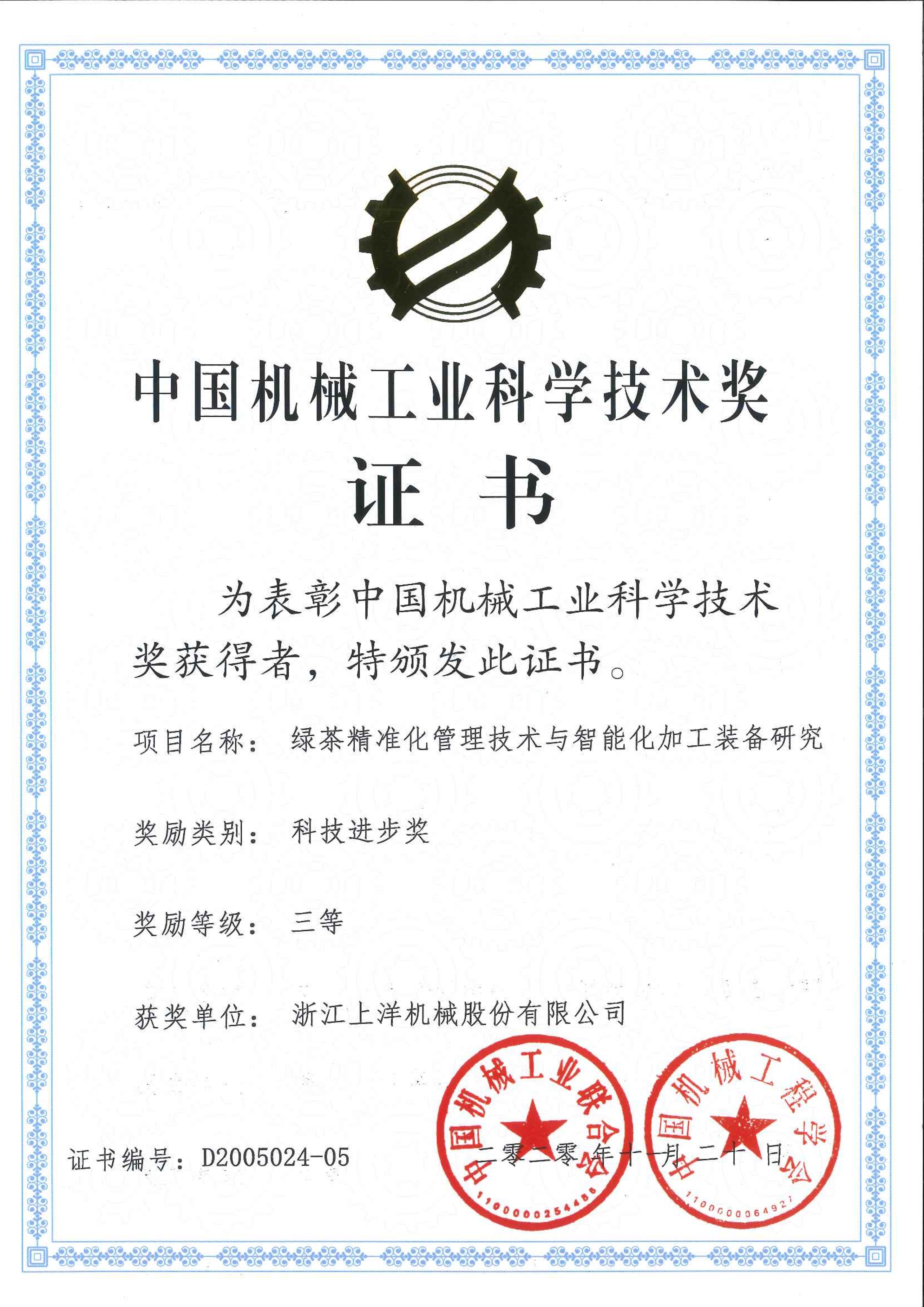 2020年中國機械工業(yè)科技進步三等獎